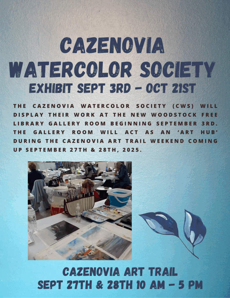 The New Woodstock Free Library will be open extra hours during the Cazenovia Art Trail: Saturday, September 27th, and Sunday, September 28th, 10:00 a.m. till 5:00 p.m. Come see the exhibit by the Cazenovia Watercolor Society in our gallery, as well as selections from the library’s art collection throughout the building.