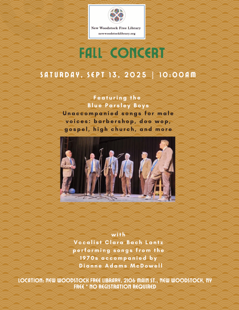 On Saturday, September 13th, at 10:00 a.m., the New Woodstock Free Library will again host a free concert featuring the Blue Parsley Boys with Clara Bach Lantz accompanied by Dianne Adams McDowell. The Boys will sing from their extensive repertoire of unaccompanied songs for male voices, and Clara will sing pop songs from the 1970s. A good time will be had by all!