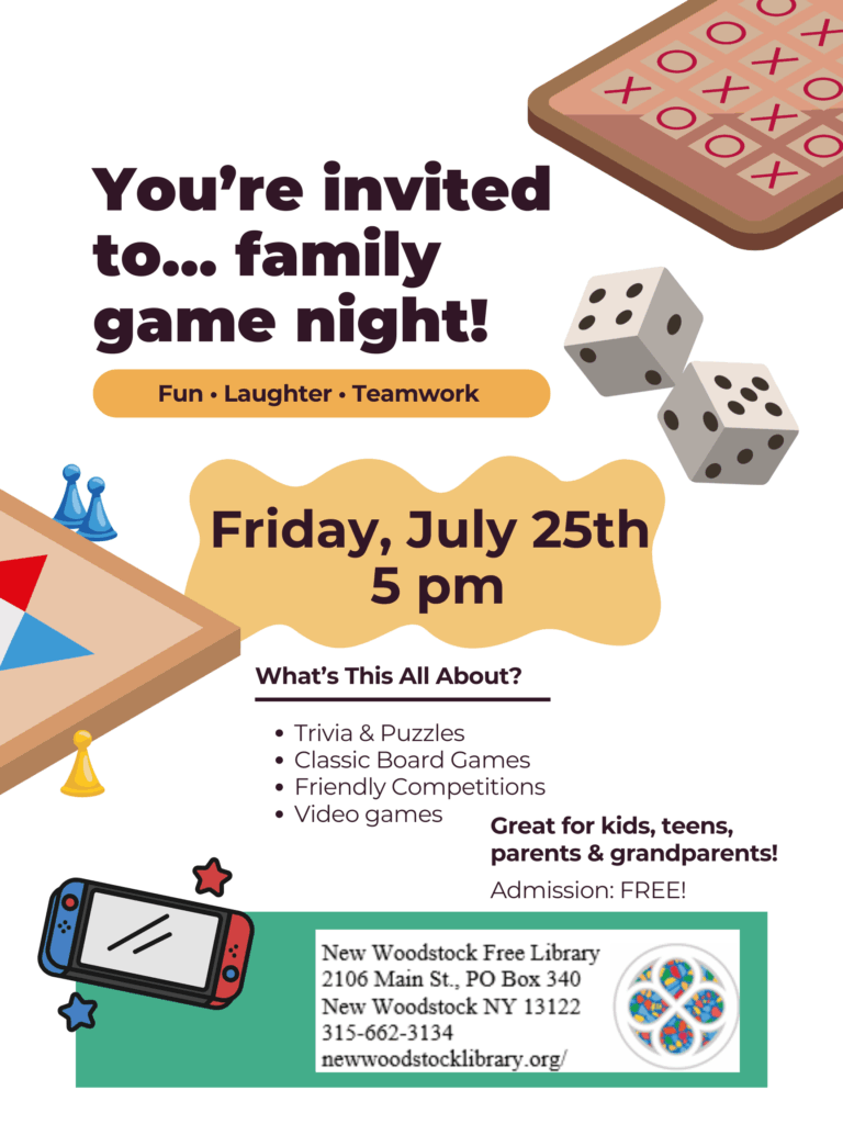 On Friday, July 25th, from 5:00 to 8:00 p.m., bring your family for a fun-filled night of gaming! Whether it’s trivia, puzzles, board games, or even video games. A great event for kids, teens, parents, and grandparents alike, with free admission!