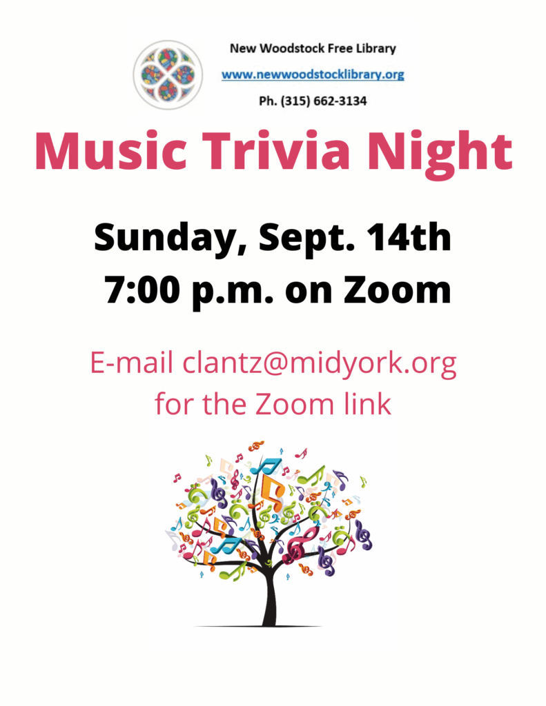 Music Trivia Night returns on Sunday, September 14th, at 7:00 p.m. The contest is for bragging rights only and is played via Zoom; e-mail Clara at clantz@midyork.org to request the Zoom link. The game consists of 4 categories of 10 questions each. This time, those categories are: