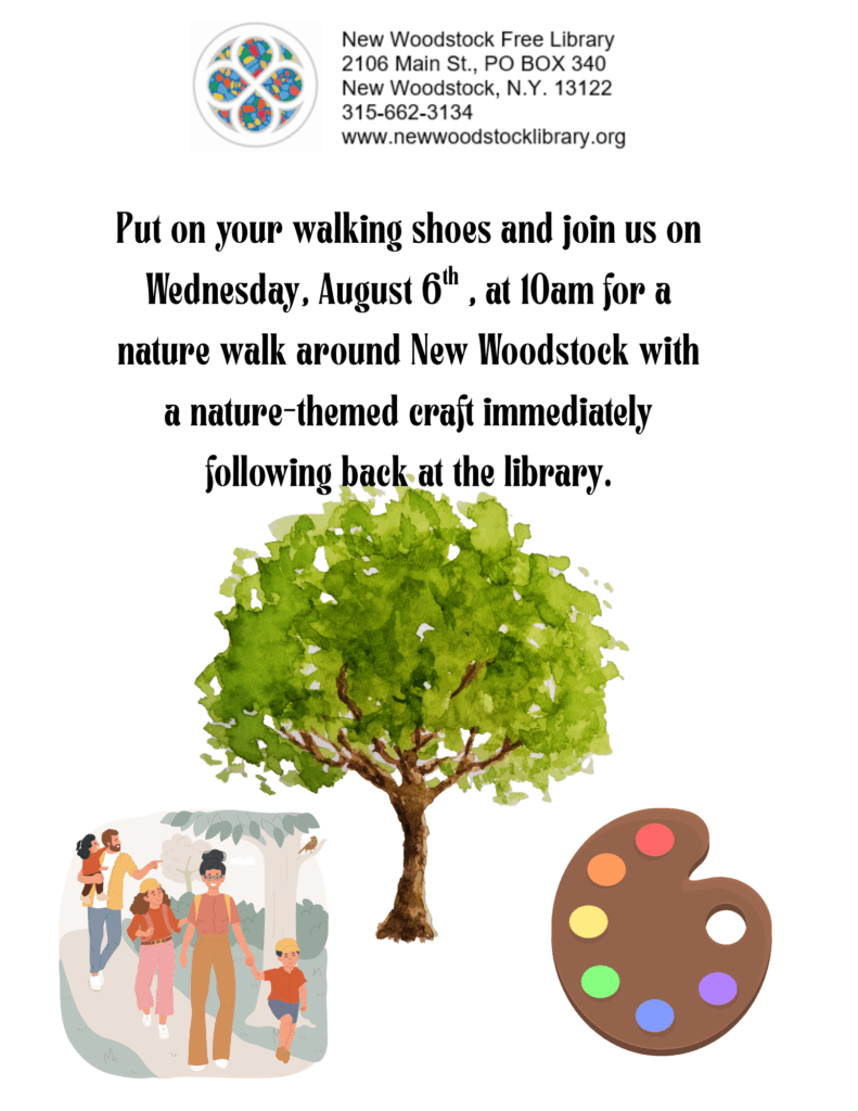 Put on your walking shoes and join us for a nature walk around New Woodstock with a nature-themed craft immediately following back at the library. Wednesday, August 6th, starting at 10:00 a.m.; all ages welcome.