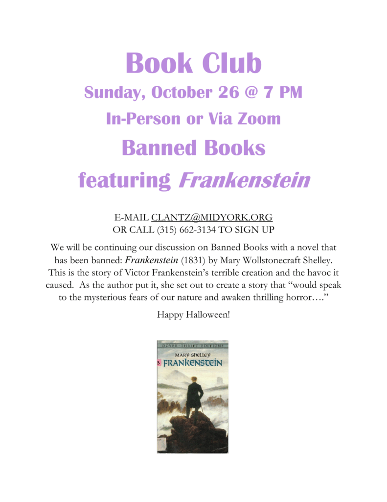 October Book Club: Banned Books featuring "Frankenstein" - Sunday, October 26th