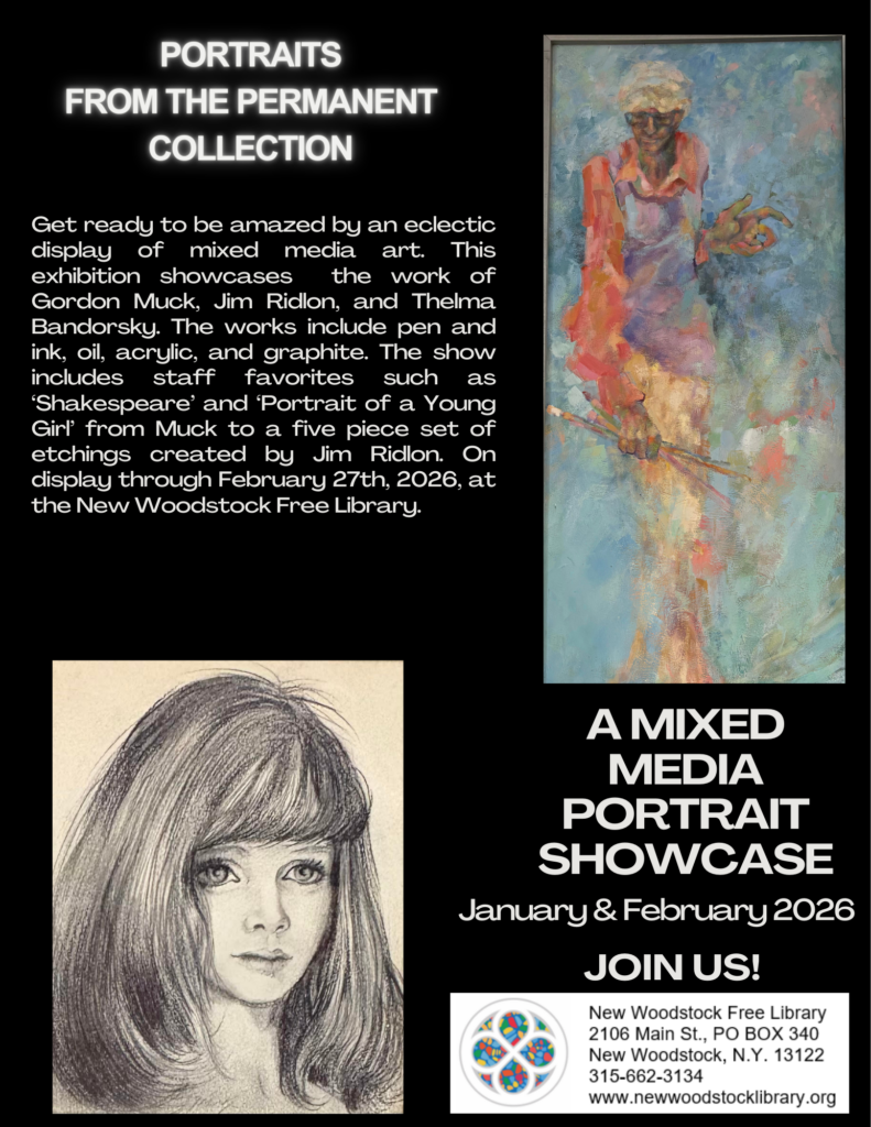 Get ready to be amazed by an eclectic display of mixed media art. This exhibition showcases the work of Gordon Muck, Jim Ridlon, and Thelma Bandorsky. The works include pen and ink, oil, acrylic, and graphite. The show includes staff favorites such as ‘Shakespeare’ and ‘Portrait of a Young Girl’ from Muck to a five-piece set of etchings created by Jim Ridlon. On display through February 27th, 2026, at the New Woodstock Free Library.