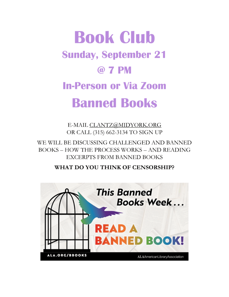 We will be discussing challenged and banned books–how the process works–and reading excerpts from banned books. What do you think of censorship?